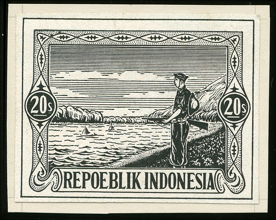 Java. Design. 026Asp, Die proof of 20s in black, size 48x37 mm, affixed on piece of cardboard. Rarely offered. € 350