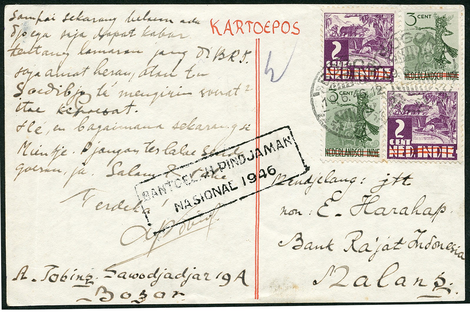 Java. Home-made postcard bearing 2x 2c Kreisler and 2x 3c dancer, all with red pencil stroke, from Bogor 10.6.46 to Malang, showing propaganda cachet (two lines in frame type 483 but not recorded from Bogor)