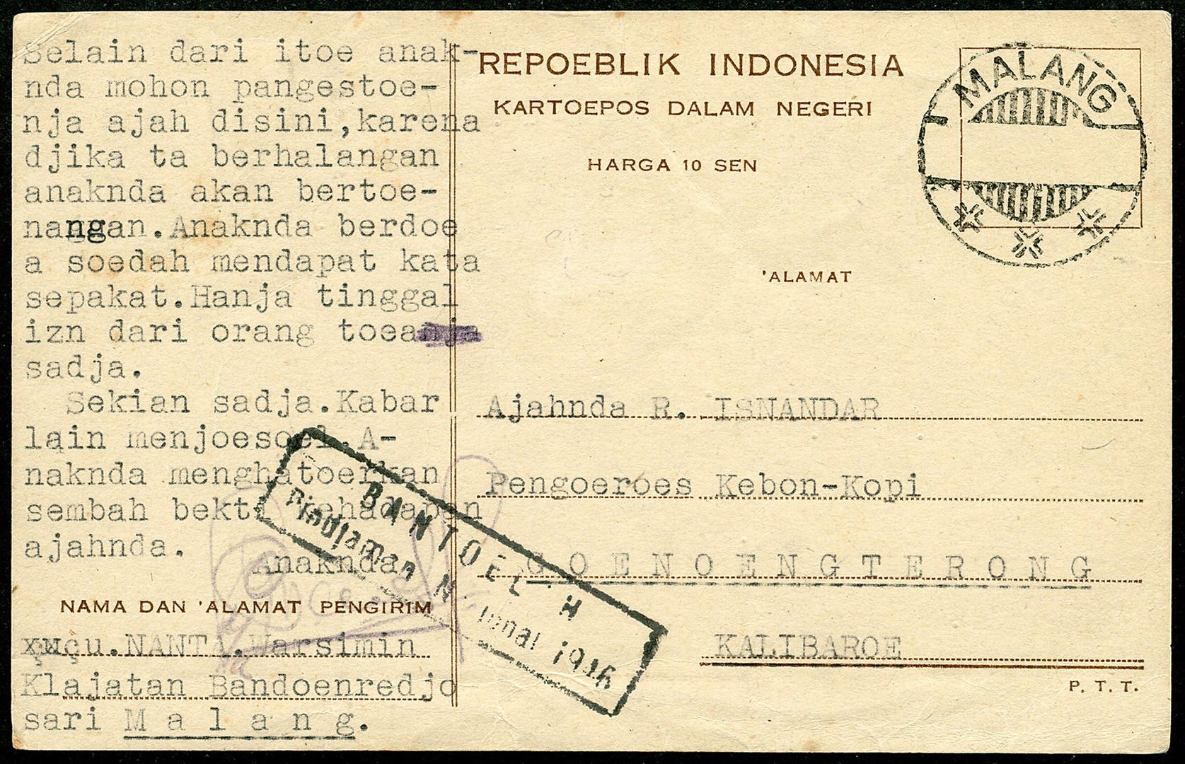 Java. 10 Sen postcard Bu.RJ13 from Malang 14.6.46 to Kalibaroe, a hand-made postcard from Malang 25.9.46 and a hand-made envelope from Malang 26.9.46 both with different types ´Porto Dibajar Malang´