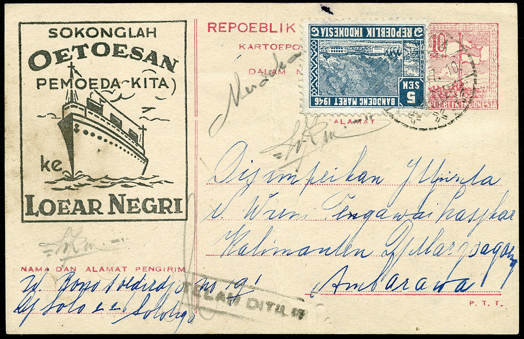 Java. 10 Sen postcard with 100 sen surcharge ´to support our delegates going abroad´ Bu.RJ18 (vertical crease) , with 5s affixed, from Solo 7.6.47 to Ambarawa