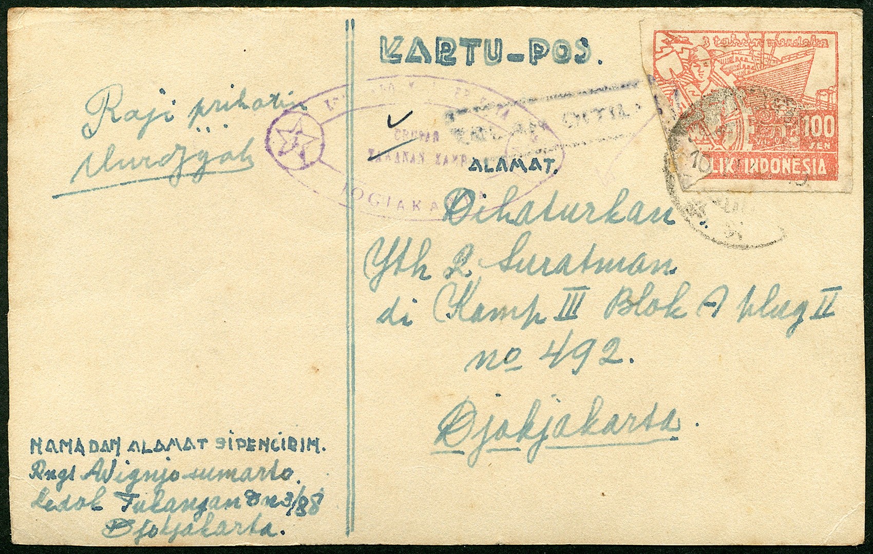 Java. Republican internee camp in Djokjakarta for those who participated in the communist insurgency of Madioen in September 1948. 100 Sen no. 045 affixed folded on home-made postcard from Djokjakarta 10.11.48 showing violet oval cachet ´KOMMANDO MILITER KOTA/URUSAN/TAWANAN KAMP/JOGJAKARTA´. Rare and most interesting