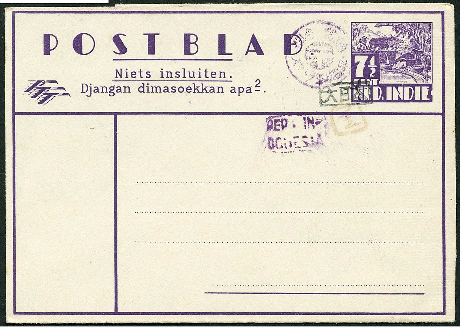 Sumatra. Palembang. 7½ Cent letter sheet with (1) black framed Palembang Dai Ni Hon overprint type 825, (2) red framed postmaster handstamp overprint of Masagoes Abdoel Aziz, (3) violet framed REP. IN-/DONESIA overprint of Palembang type 54 and (4) Postage paid mark, Bu.RS30 (RRR). Extremely rare, only unused recorded and probably only one or two copies known