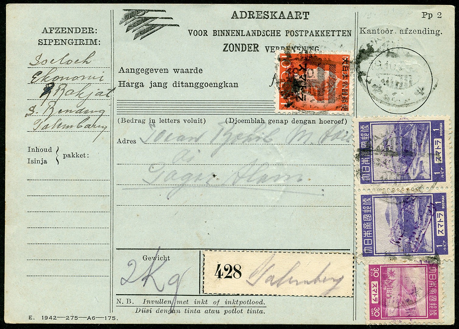 Sumatra. Palembang. 10 Cent Van Konijnenburg with machine T and probably REP. IN-/DONESIA overprint no. 54v-92z-43´ and definitive issue for occupied Sumatra of 30c and 1Rp in pair on complete parcel post card Bu. RF40 from Palembang 19.10.46 via Lahat 24.10.46 (4 with pencil) to Pagaralam 22.10.46
