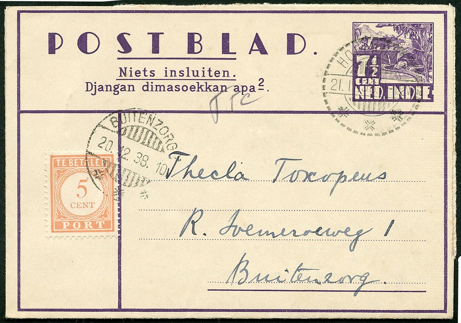 Pb. G3 van Hollandia 21-11-1938 naar Buitenzorg en daar op 20-12 met 5c port belast, omdat de afzender, de entomoloog Dr. L.J. Toxopeus, voor zijn dochter een plantje heeft ingesloten. Een beport postblad, omdat iets is ingesloten, is zeer zeldzaam