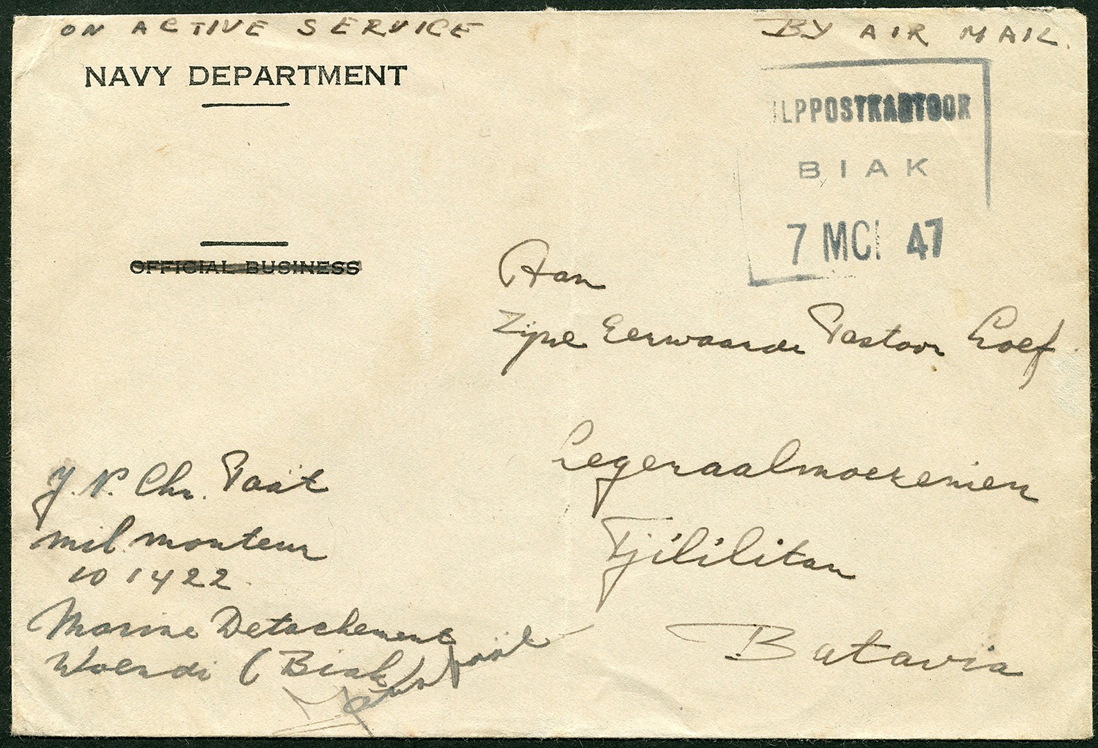 Rechthoekig stempel HULPPOSTKANTOOR/BIAK (Bu. type Y) op ongefr. env. van het Navy Department op 7 MCH 47 naar Batavia/Centrum 12-3, en op env. van het Kon. Magnetisch en Meteorologisch Observatorium, Filiaal Biak, gefr. met 10c op 3 APR 47 naar Batavia 6-4