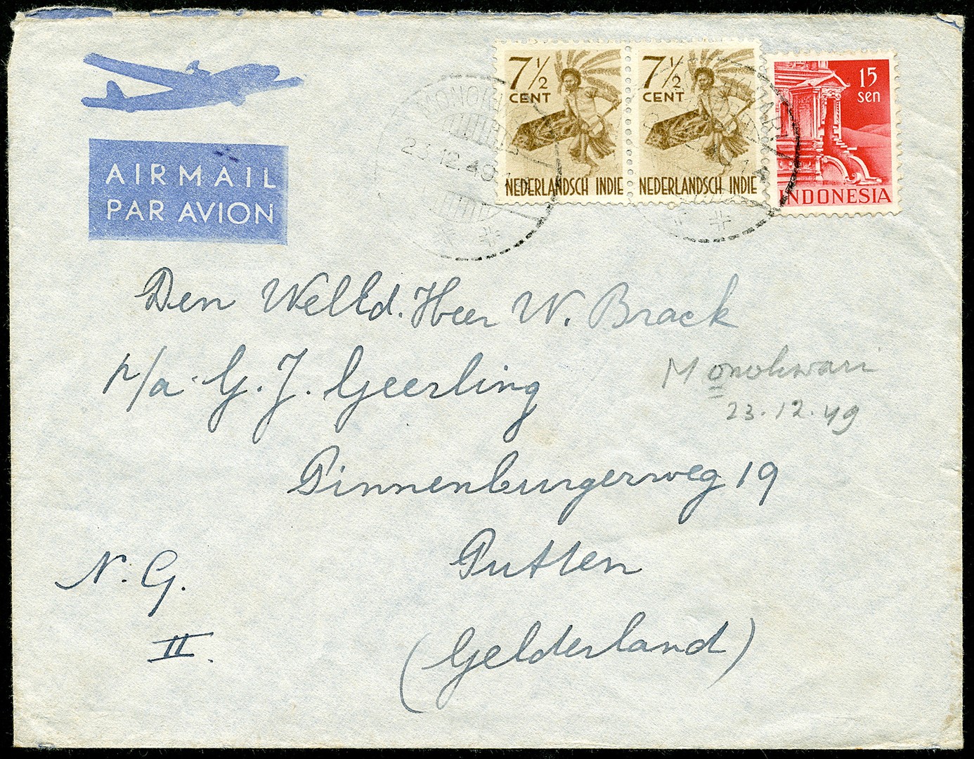 Env. met 7½c danser in paar en 15s Indonesia, licht afgest. met het veel minder voorkomende MONOKWARI, op 23-12-1949 per luchtpost naar Nederland
