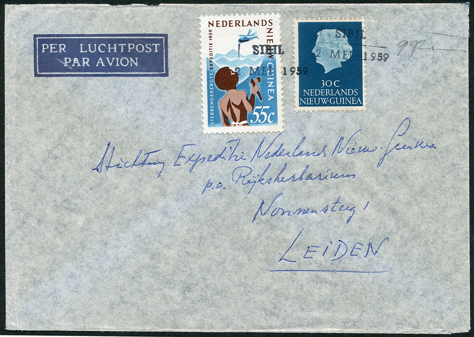 Expeditie Sterrengebergte. Env. van 9 gr. geschr. door Dr. Brongersma gefr. met 30c en 55c 2x afgest. met naam-/datumstempel ´SIBIL/2 MEI 1959´ (laatste dag van gebruik) naar Stichting Expeditie Nederlands Nieuw-Guinea te Leiden
