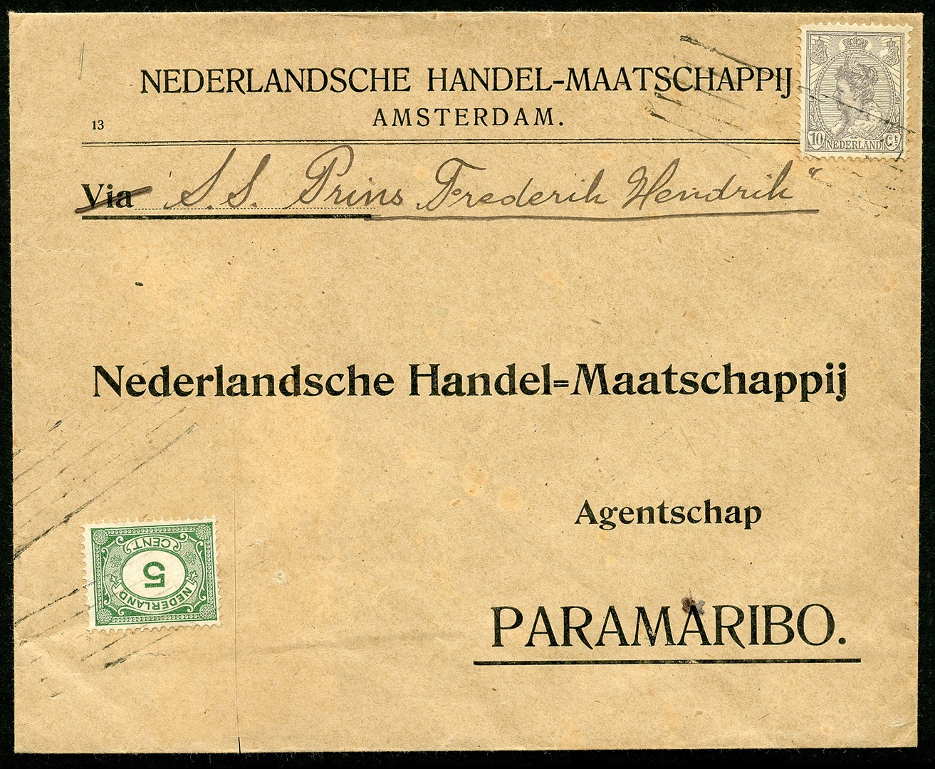 Firmacouvert uit Amsterdam gefr. met 5c (waarnaast gerep. knip in env.) en 10c, onafgestempeld gebleven, met de S.S. Prins Frederik Hendrik naar Paramaribo 12-10-1922 waar de zegels met het 5-strepenstempel zijn ontwaard (zie: ES. p. 368-369)