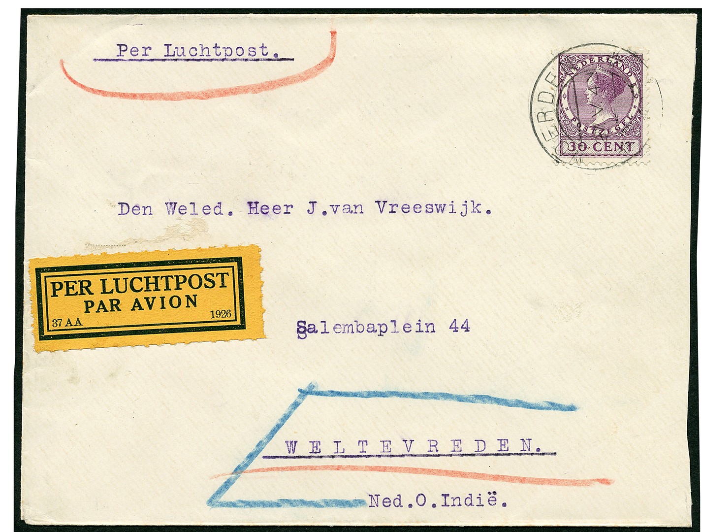 Nederland. Couvert met 30c Veth als enkelfrankering voor het briefport + 15 cent luchtrecht Amsterdam-Marseille, van Woerden 27-5-1926 naar Weltevreden 18-6. Kopie krantenknipsel bijgesloten. VH.B.6