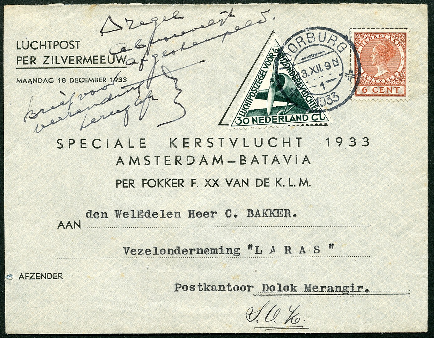 Nederland. Driehoekzegel op env. ´speciale kerstvlucht 1933´ naar Indië. Env. gefr. met 6c Veth en driehoekzegel, afgest. Voorburg 13-12-1933 waarnaast geschreven ´[driehoek] zegel abusievelijk afgestempeld. Brief voor verzending terug afz.´ Tevens env. met 25pf Duitse Rijk afgest. Schönebeck-Bad Salzelmen 15-12-1933 waarnaast driehoekzegel met sp. afst. naar Medan 22-12