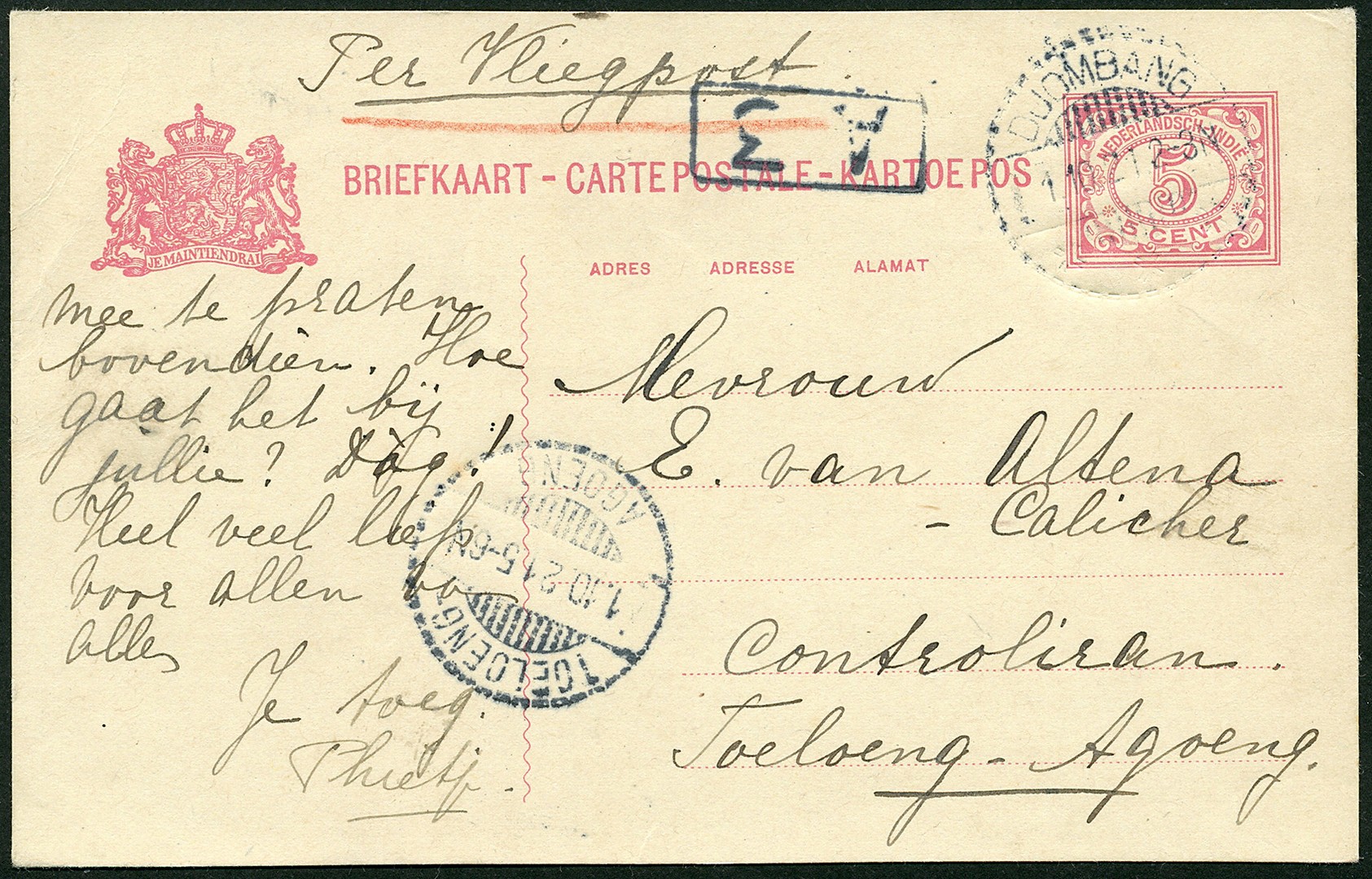 Ned.- Indië. Bk. van Djombang 1-10-1921 ´per eerste vliegpost, die in Tg. Agoeng neer zal strijken´ zonder luchtrecht per particuliere vliegmachine meegevlogen naar Toeloengagoeng 1-10-1921, met Hussni als piloot: ´... Hussni is een betrouwbaar aviateur.´ Niet in luchtpostcatalogus vermeld, aansluitend op VH.C.19. Luchtpostrariteit!