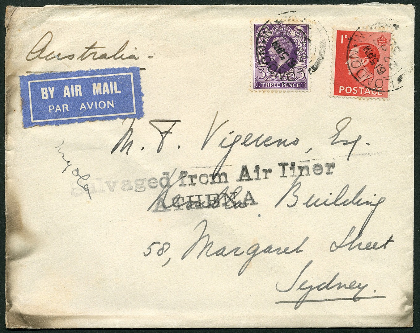 Ramppost. Env. van Londen 22-9-1936 met bestemming Sydney, met de ´Athena´ van de IA die, op weg naar Singapore, in New Delhi op 29 sep 1936 door vuur is verwoest, met tweeregelig ´Salvaged from Air Liner/ATHENA´. N.360929c