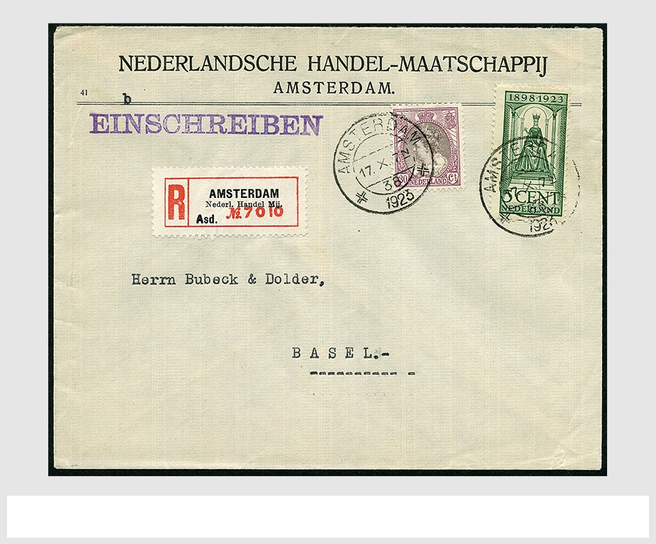 POSTHISTORIE, Jubileum 1923, 24 poststukken w.o. aangetekend en aardige mengfrankeringen met emissies Bontkraag en Veth