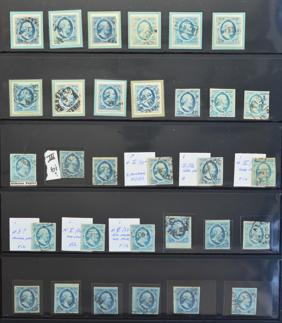 EMISSIE 1852, 5c (35x) en 10c (6x + 1 paar) w.o. geplaat en met randstukken, 10c plaat X in paar op brief van Zaandam 5-6-1863 naar Antwerpen, tevens vouwbrief uit Ossendrecht 7-4-1854 waarop halfrond-franco Bergen op-Zoom A