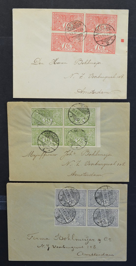 TBC-zegels nrs. 84/86 in blokken van vier, elke waarde op apart couvert, lokaal verzonden in Amsterdam op 3-1-1907 (1c), 11-1-1907 (3c) en 19-1-1907 (5c)