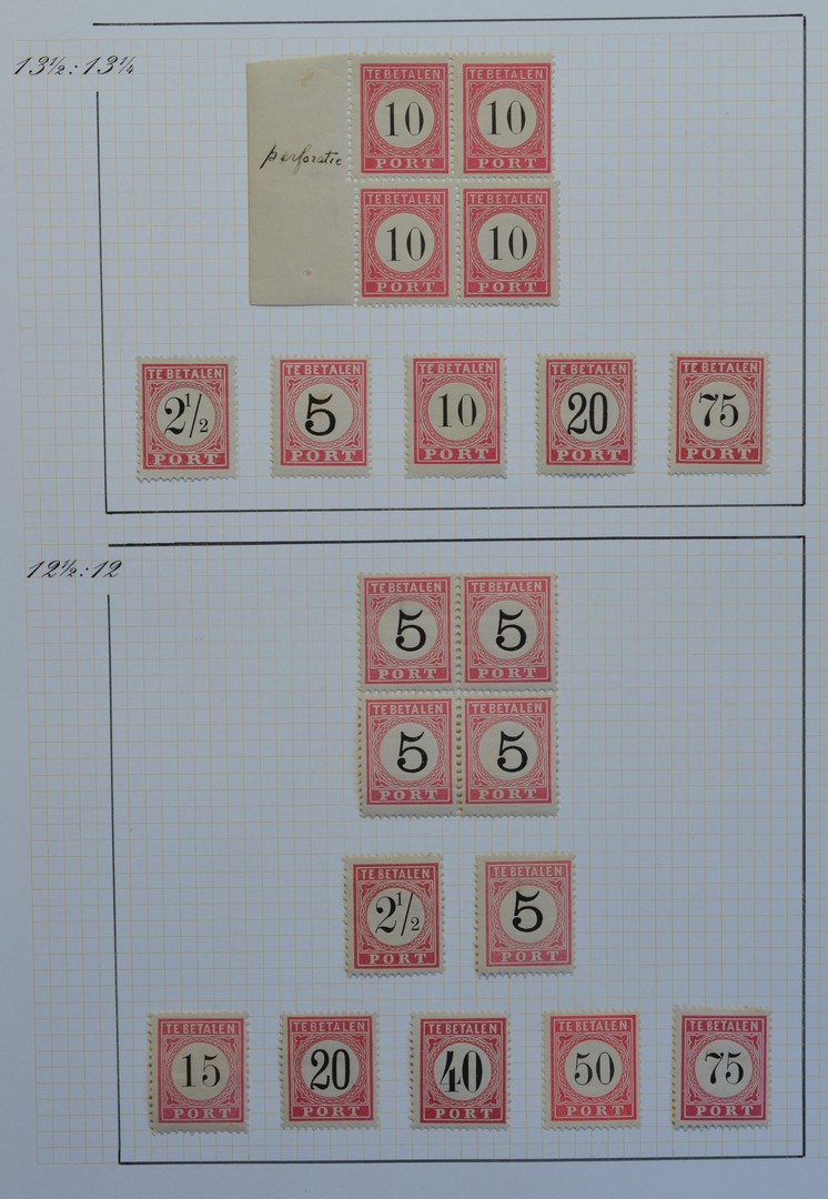 NED.- INDIË Portzegels, emissie 1882 kleine, op typen, tandingen en plaatfouten gespecialiseerde collectie bestaande uit meest ongebruikte zegels w.o. 75 cent in veldelen, samenhangende typen in blokken (o.a. 20 cent P9D type II+III/I+III), 75 cent in gecombineerde tanding, etc. keurig opgezet op 6 bladen