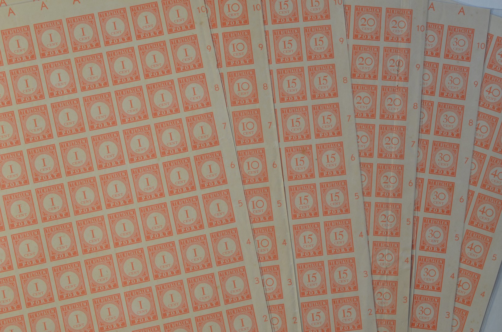 NED.- INDIË, Portzegels Indische druk 1941, ongeperforeerde en ongegomde halve vellen van 100 zegels gedrukt door Kolff van de 1, 10, 15, 20, 30 en 40 cent met fragment ´fiat drukken´ door CBA4