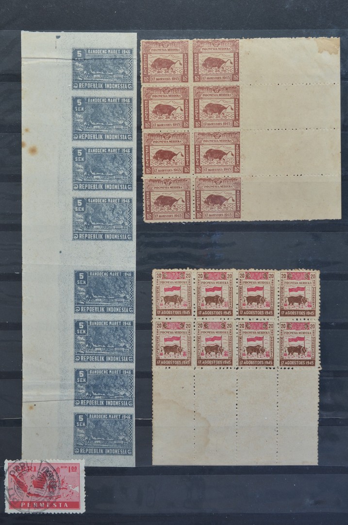 REPUBLIK INDONESIA 1945-1949, Java, Perforation proofs KPI.J23D (block of 8), J24E (block of 8), J29ACb proof, smaller size (strip of 8), together Rp. 15.200.000 and Celebes, Permesta Rp 1 cancelled Kotamobagu (€ 250). Also Japanese occupation Sumatra, commemorative cachet ´Third Ann of Great East Asia War´ of Medan on complete set Definitives in blocks of four