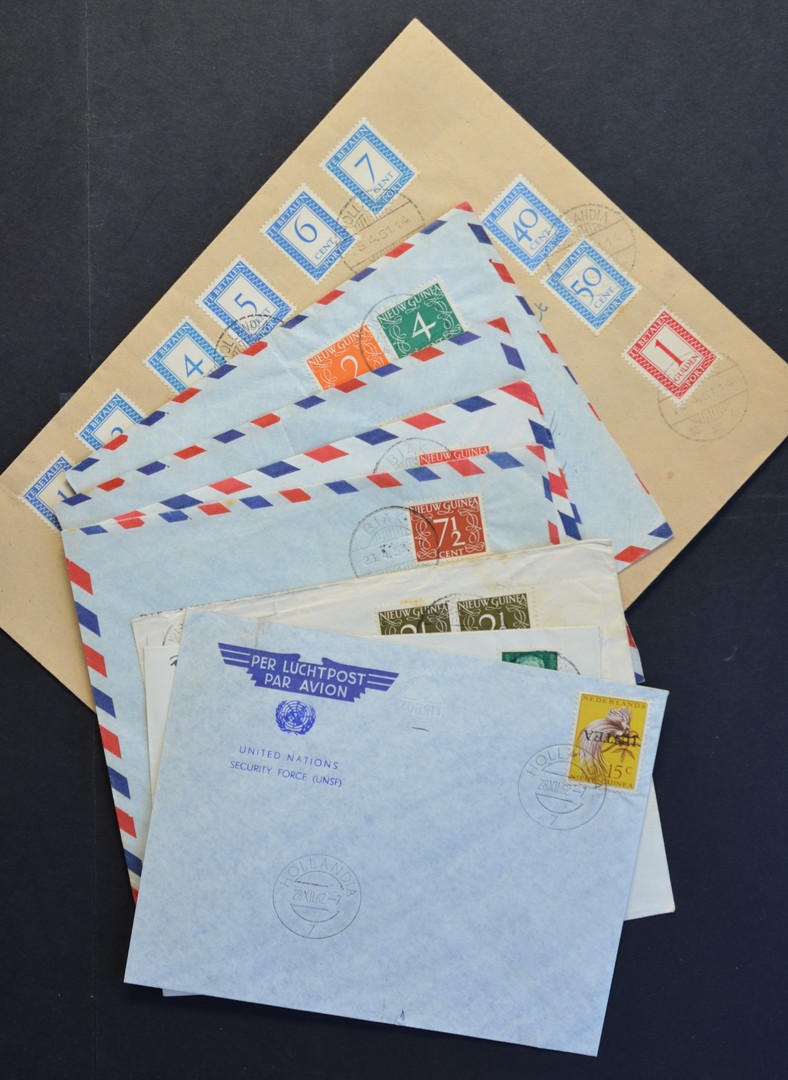 NED. NIEUW-GUINEA, 7 enveloppen waarop o.a. Nederlandse portzegels, alsmede kopstaande UNTEA nr. 7f op blanco envelop