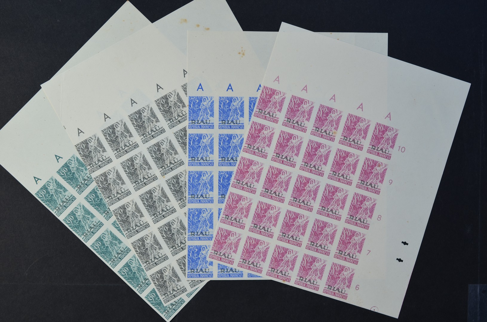 INDONESIË, Riau, KPI.13A/16A, 70, 75, 80 en 90 sen met opdruk RIAU in ongeperforeerde, ongegomde rechter bovenhoek blokken van 25 zegels, met hier en daar een bruin puntje, Rp. 37.5000.000