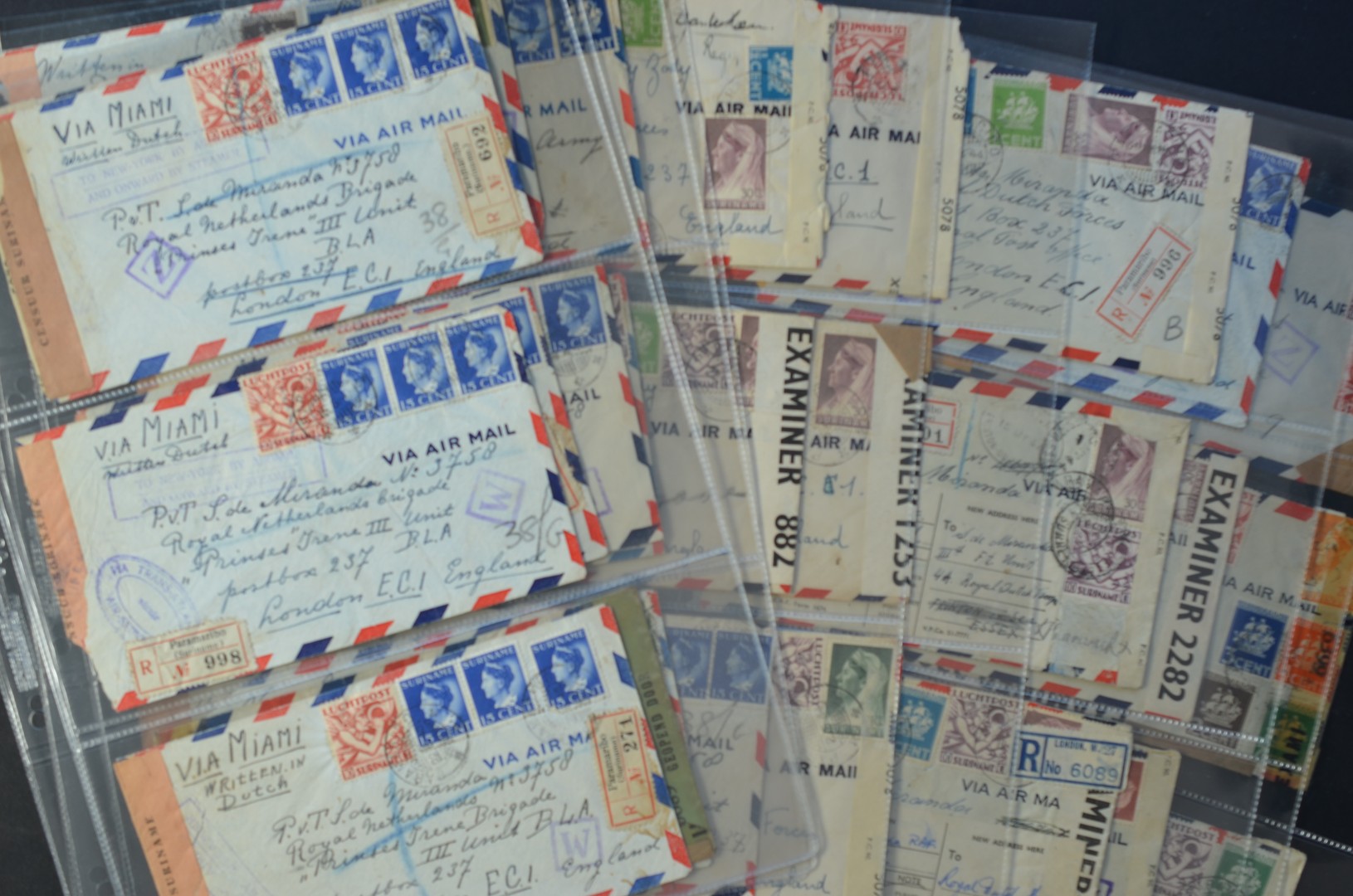 SURINAME POSTHISTORIE, 30 gecensureerde enveloppen (waarvan 1 uit Curaçao) 1944-45 per luchtpost naar een militair van de Prinses Irene Brigade in Londen, documentatie bijgesloten