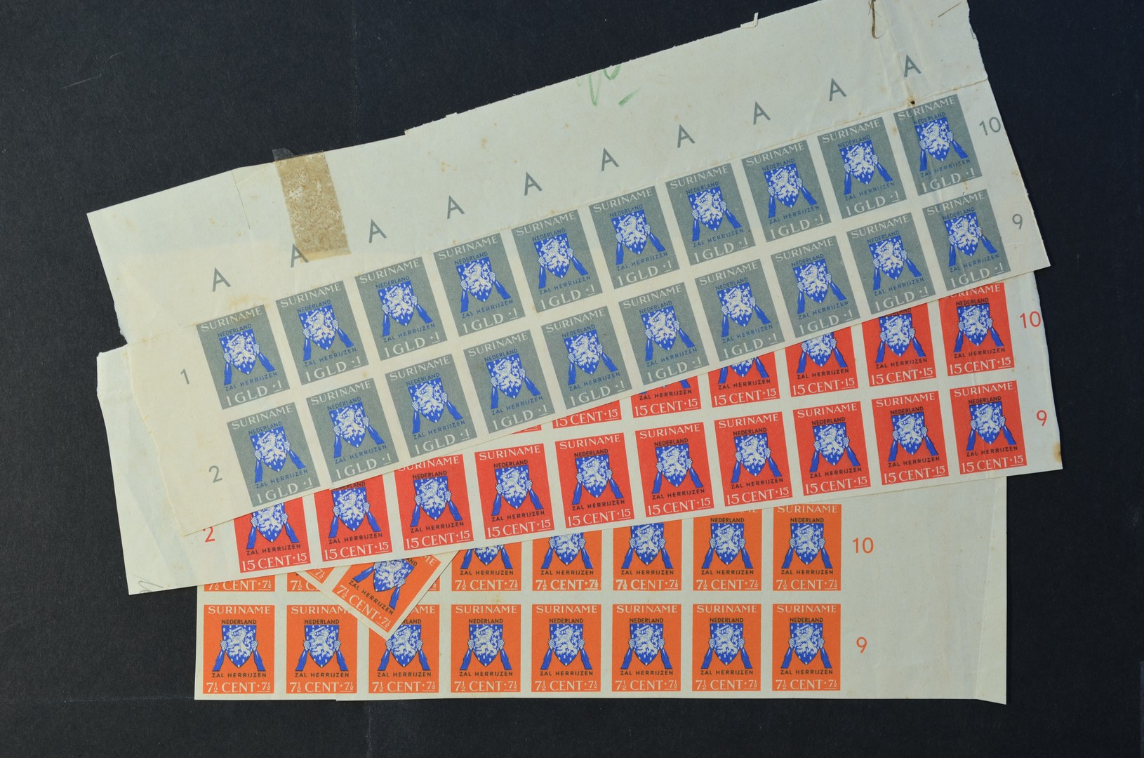 SURINAME, Vrij Nederland-zegels nrs. 197/99, ongeperforeerd en ongegomd in zeer fraaie veldelen van 20 stuks