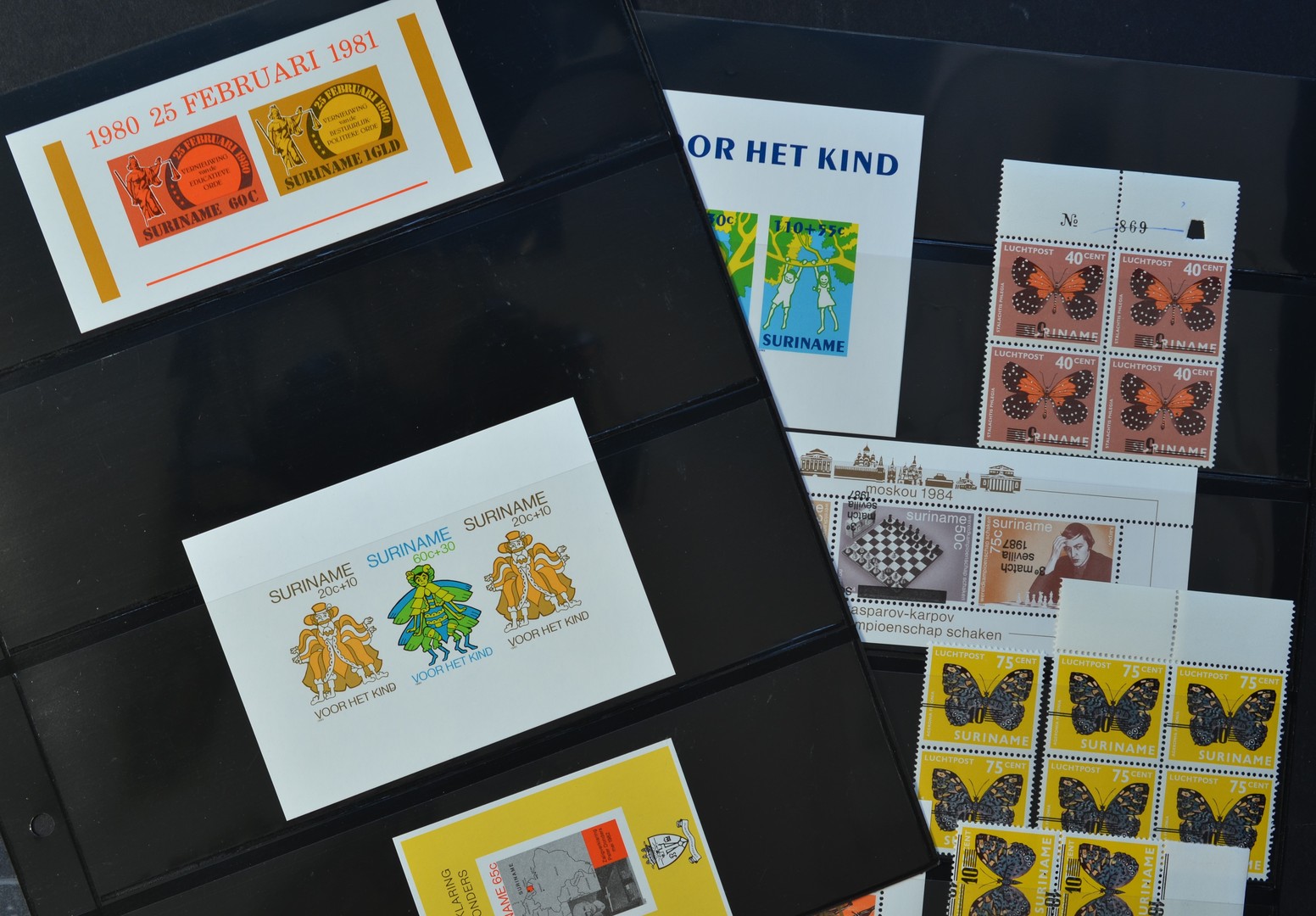 SURINAME REPUBLIEK, Zonnebloem nrs. 229, 246, 258,300, 608, 684 en 754 alle ongetand postfris en de nrs.100 en 101 in blokjes en paar, alsmede nrs.566 en 633 met opdrukafwijkingen. Hoge waarde!