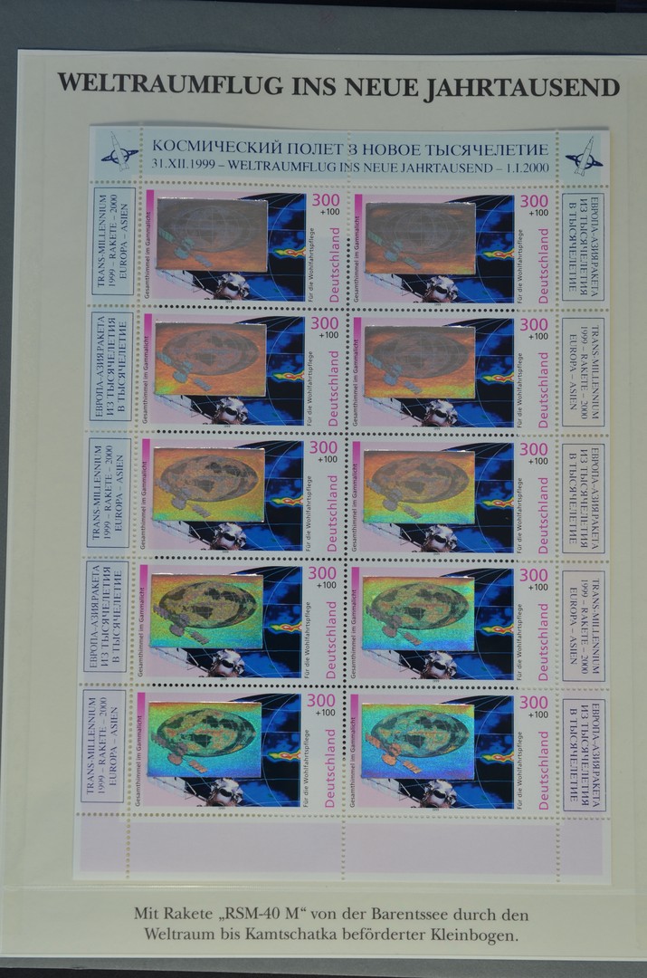 MOTIEF: Ruimtevaart, Russia RSM-40M, 1999- Trans Millenium-Rocket, the space flight into the new millenium, entire small sheet of Federal Republik of Germany 1999, charity stamp "Der Kosmos", 300 + 100 (Michel 2081), flown with Russian Trans-Millenium-Rocket RSM-40M, launched from submarine 'Murena' located in the Barents Sea through space to Kamchatka, certificate of authenticity and signed by Sieger, 3000 small sheets flew on 31.12.1999 to the 01.01.2000