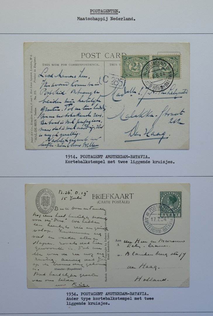 POSTHISTORIE, Postagenten aan boord van mailschepen van de SMN, de Rotterdamsche Lloyd, de HAL, Walvisvaarders, diverse stoombootdiensten in Nederland en in portierloges van stoomvaartmaatschappijen in Indië, totaal 82 mooie poststukken van 1904-1966 met uitsluitend prachtafstempelingen, keurig opgezet in ringband