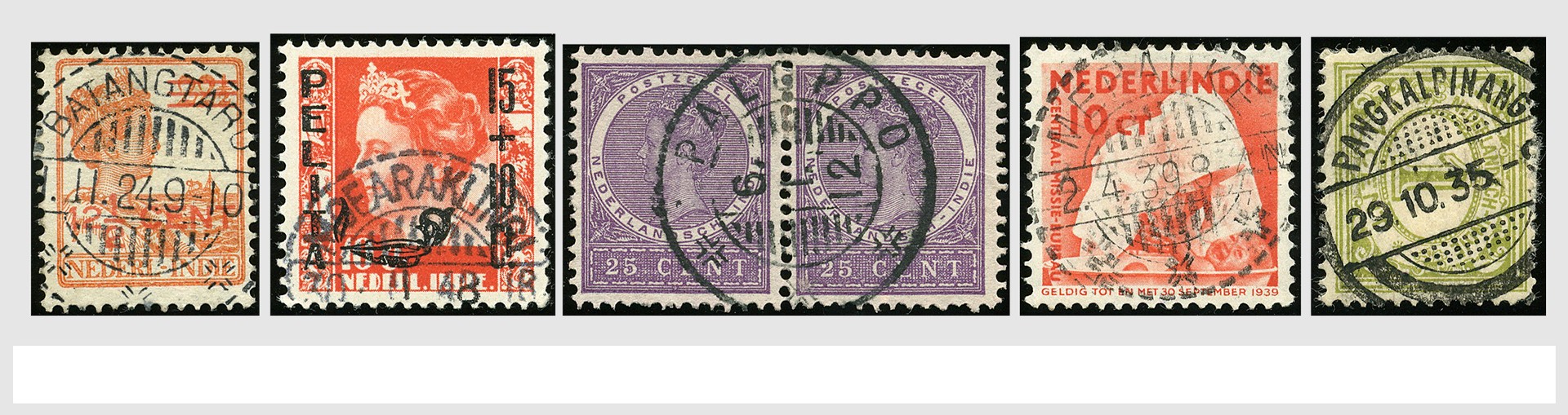 NED.- INDIË POSTHISTORIE, verzameling van diverse typen stempels w.o. punt, korte- en langebalk, kortebalk met uur- en puntvlakvulling op diverse emissies en waarden, met verschillende schaarse ex. en mooie afstempelingen, in insteekboek