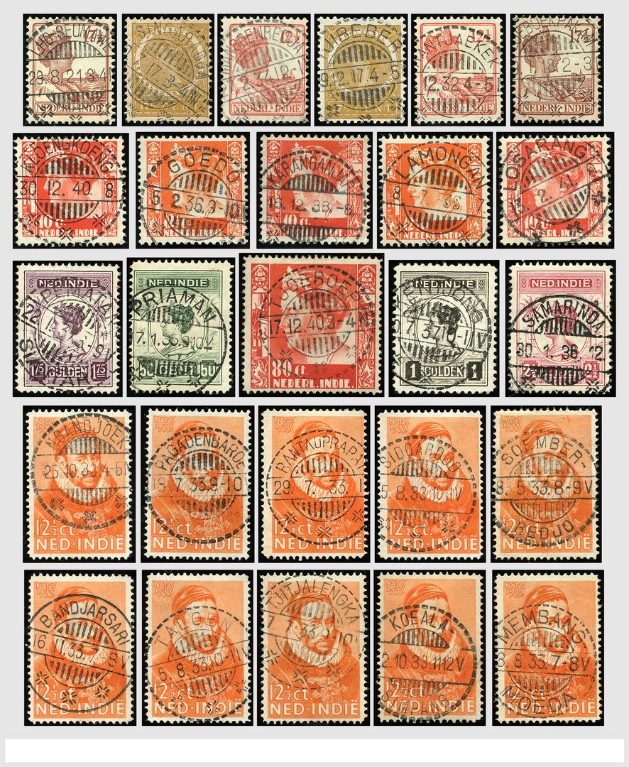 NED.- INDIË POSTHISTORIE, insteekboek met collectie langebalkstempels 1917-1942 van A t/m W op losse zegels waarvan sommigen op briefstukje, met diverse typen smalle- en brede balk, gesloten buitenring of biffage, etc. w.o. van meerdere kleine hulppostkantoren, veel op lichtkleurige zegels en merendeels in uitgezochte kwaliteit. Mooi object om verder uit te bouwen en op te zetten!