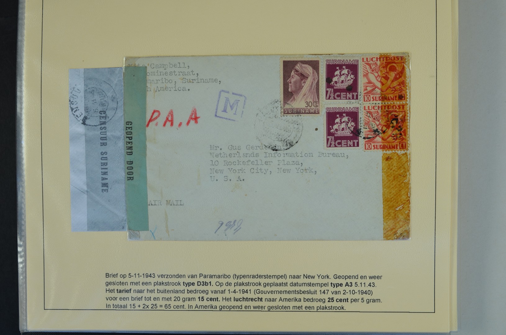 SURINAME POSTHISTORIE, Censuurpost Tweede Wereldoorlog, bijzonder goed gedocumenteerde en beschreven, geheel intact gelaten collectie van ca. 300 poststukken, meest vanuit Suriname, enkelen naar Suriname, met een grote verscheidenheid aan censuurstempels en stroken, frankeringen, etc. op bladen in 5 ordners