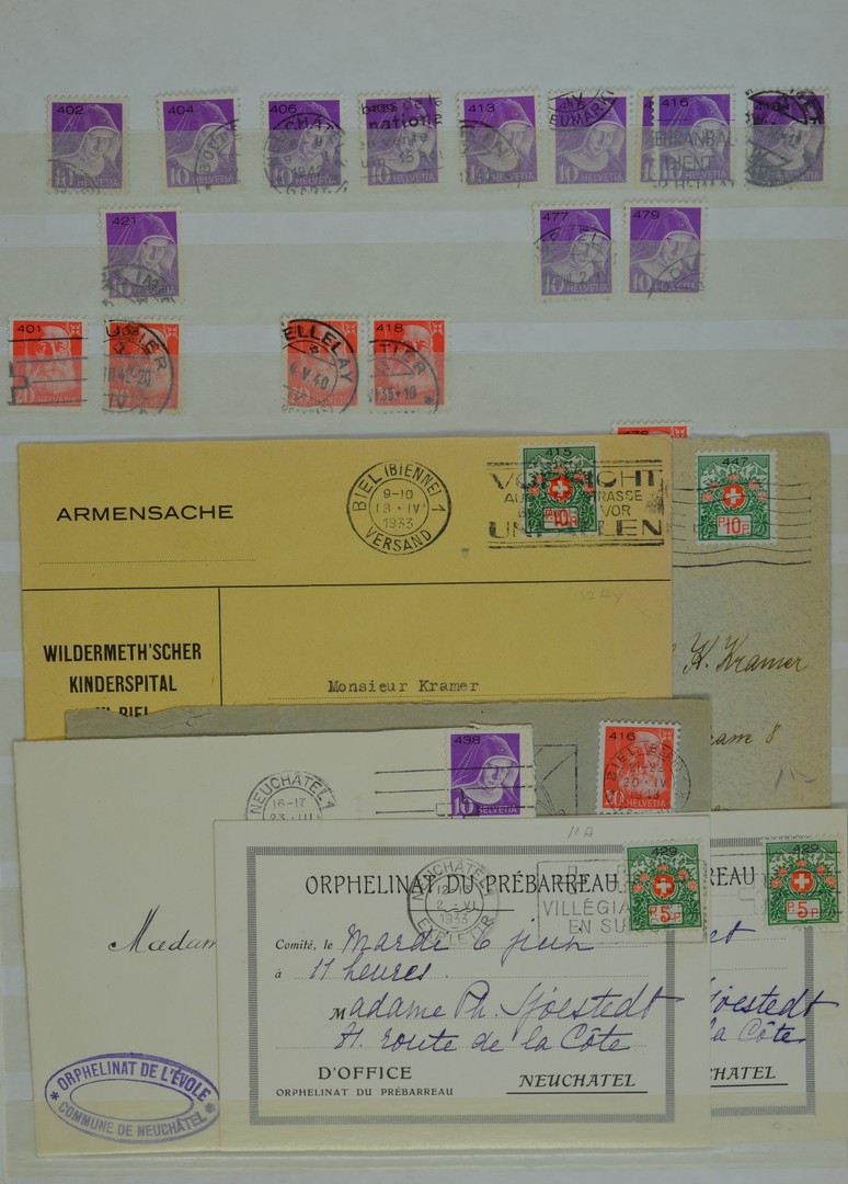 ZWITSERLAND, Portvrijdomzegels op kanton, plaats en nummer opgezet in dik insteekboek, wb. papiersoorten, grote- en kleine nummers, alsmede ruim 40 brieven en enkele kaarten. Leuk voor de specialist!