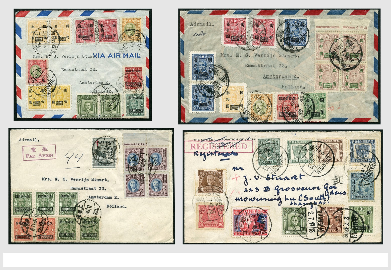 CHINA, fine collection of 50 covers, mostly the 1930s and 1940s from Shanghai by airmail to the Netherlands, or locally sent in Shanghai, showing a wide variety of colourful frankings, all from an authentic correspondence, housed in an album