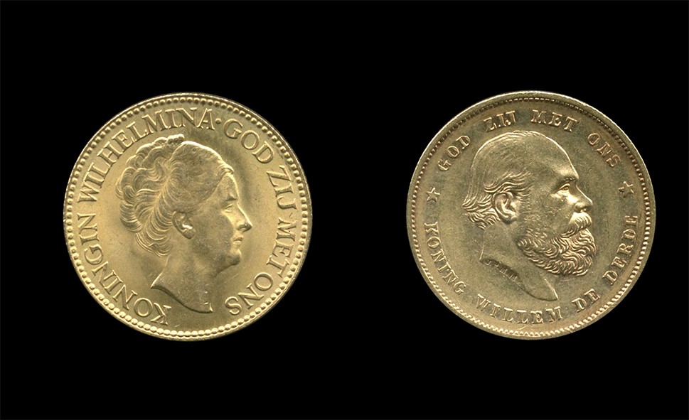 NEDERLAND, gouden 10 Gulden Willem III 1877 (Sch.551), en gouden 10 Gulden Wilhelmina 1925 (Sch.749),PR