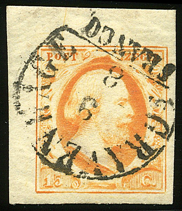 3b, pos. 76. Zeer breed gerand luxe hoekstuk met volledig ´sGravenhage A. Hoekstukken van de 15 cent zijn zeldzaam, en zeker in deze kwaliteit