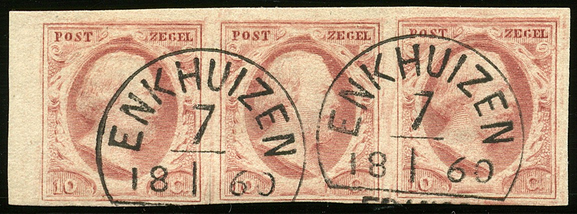 ENKHUIZEN C (EY.175) op 10 cent nr. 2j-Pl.V-26/28. Onder zegel 27 iets smal knipje tussen de zegels 26/27, overigens buitengewoon aantrekkelijke luxe randstrip van drie, met twee prachtige afst. Ex Dreikurs
