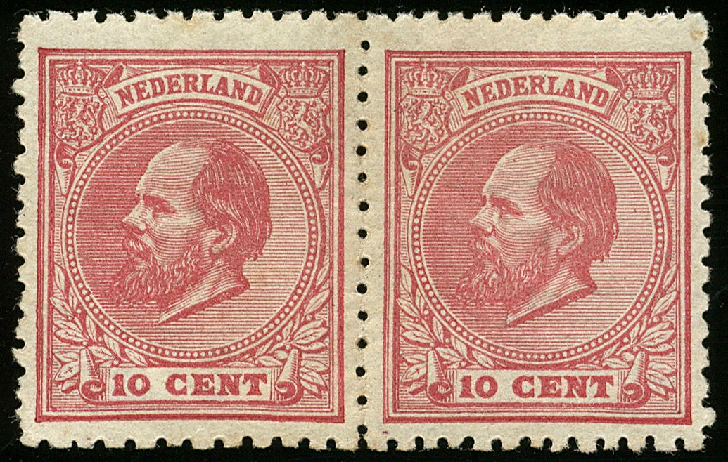 21E + 21D, 10 cent rood in gecombineerde tanding 11½ x 12, 12½ x 12, postfris vrijwel prachtpaar met iets geoxideerde gom en cert. Bakker (2011) € 1500