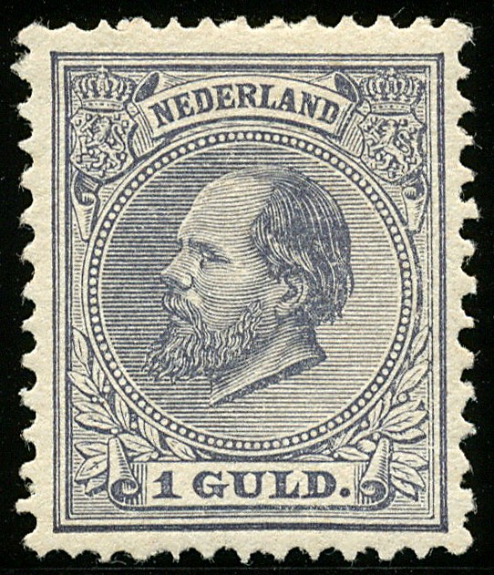 28H, 1 Gulden grijsviolet, Kt.12½ x 12 gr.g., ongebruikt prachtex. met cert. Muis (1996) € 750