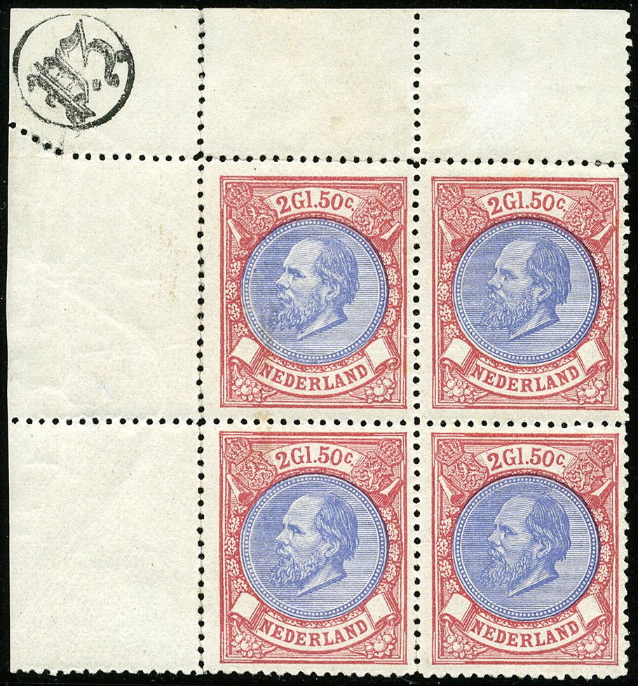 29A, 2½ GULDEN ROOD EN BLAUW, LT.14 KL.G., IN LUXE ONGEBRUIKT HOEKRANDBLOK MET LETTERS P.Z., WAARIN BOVENSTE TWEE EX. POSTFRIS, EN DE ONDERSTE TWEE EX. MET MINIMAAL PLAKKERSPOORTJE. ZELDZAAM BLOK IN PRACHTKWALITEIT MET CERT. NVPH (1977) € 15.800