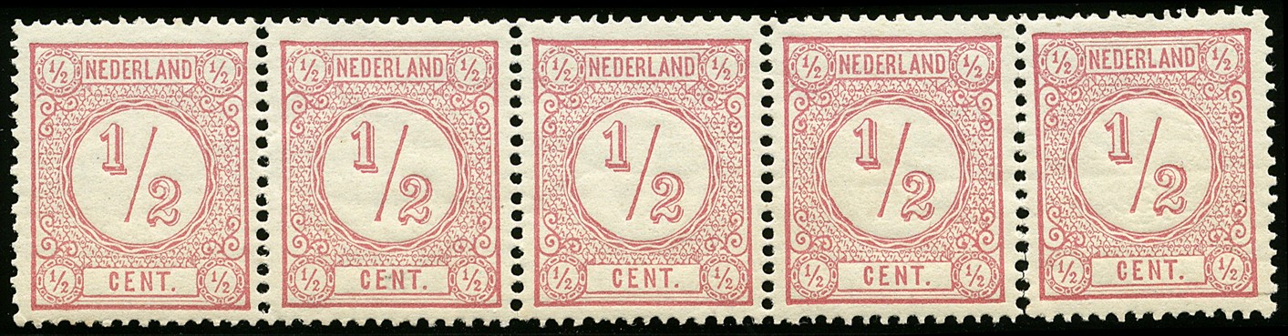 30BI, ½ cent roze in postfrisse, horizontale strip van vijf (rechter ex. tanding iets los) € 250
