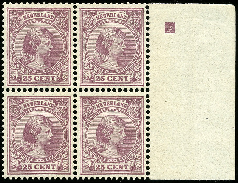 42, 25 cent lila, postfris pracht randblok van vier met cert. Muis (2000) € 3300