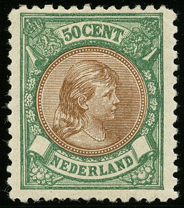 45C, 50 cent donkergroen en bruin, Lt.11, ongebruikt prachtex., slechts enkele ongebruikte ex. bekend. Zeer zeldzaam! Cert. NVPH (1986) € 3150