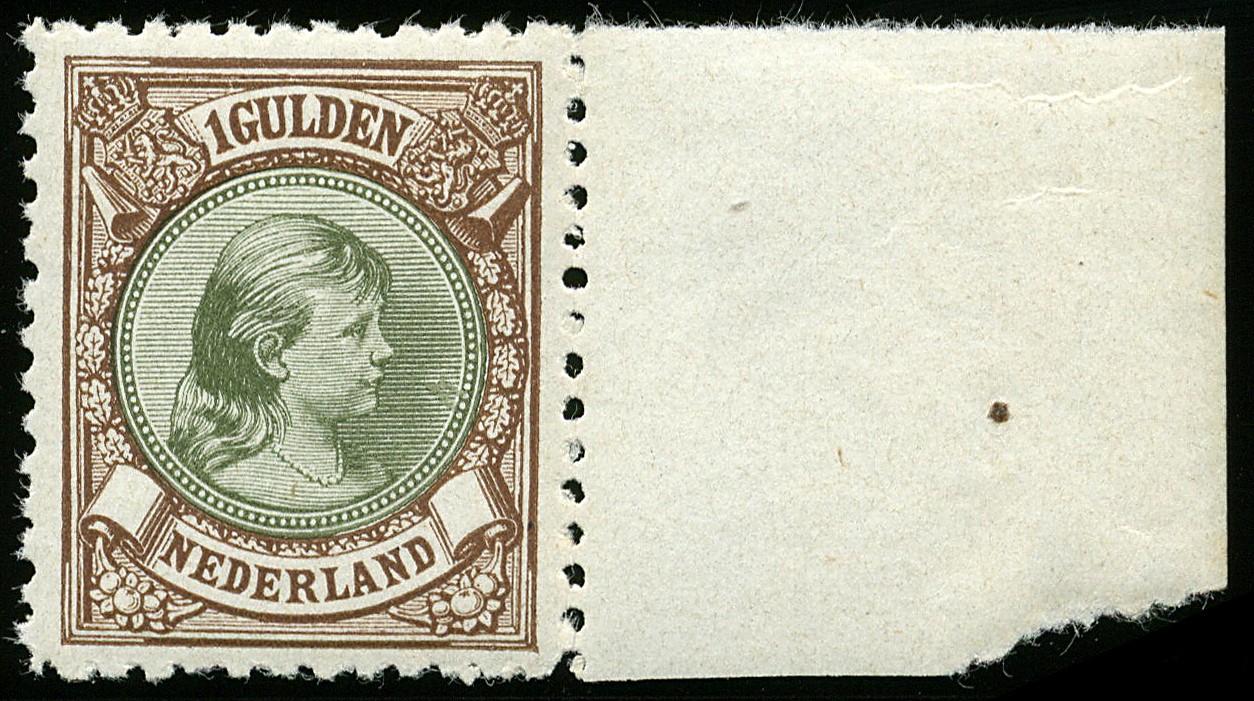46C, 1 Gulden bruin en olijfgroen, Lt.11, postfris rechterrandstuk met origineel papier-onregelmatigheidje in de gom en cert. Vleeming (2014) € 1350