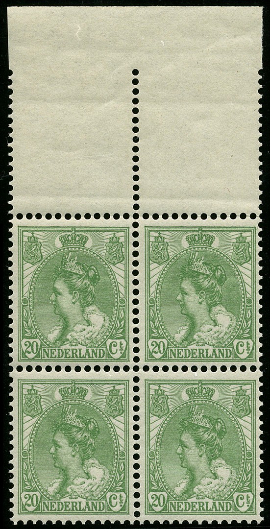 68, 20 CENT GROEN IN LUXE POSTFRIS BLOK VAN VIER MET BOVENVELRAND EN CERTIFICAAT VLEEMING (2015) € 6400