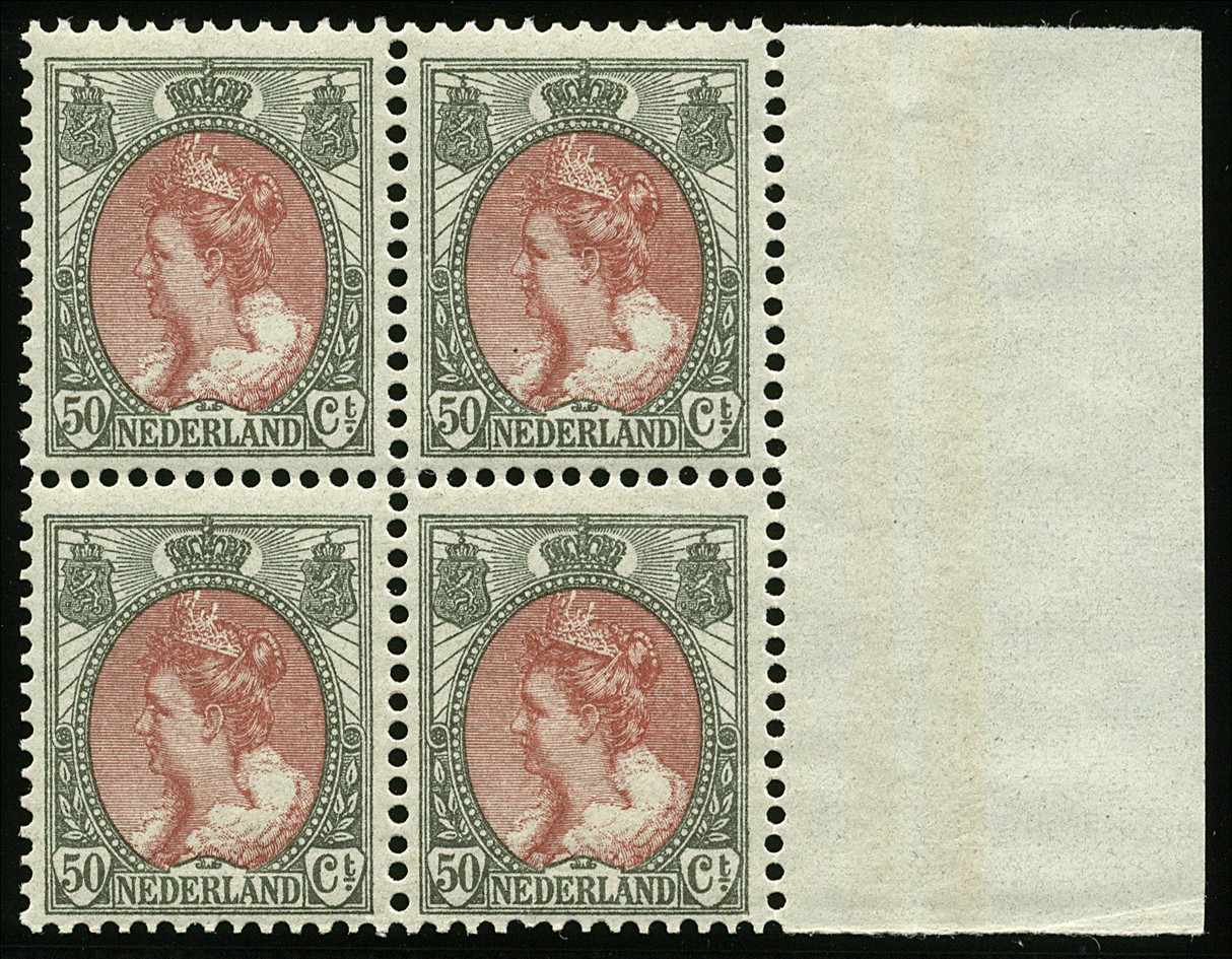 74, 50 cent bronsgroen en bruinrood in luxe blok van vier met rechtervelrand € 2200