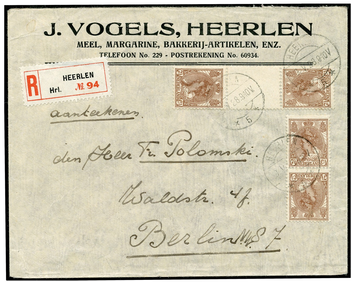 61b/c, 7½ cent keerdrukken met en zonder tussenstrook op aangetekende firma-envelop van Heerlen 9-V-'28 naar Berlijn, op a.z. ak. 10.5. Zeldzaam. Cert. Vleeming (2015)
