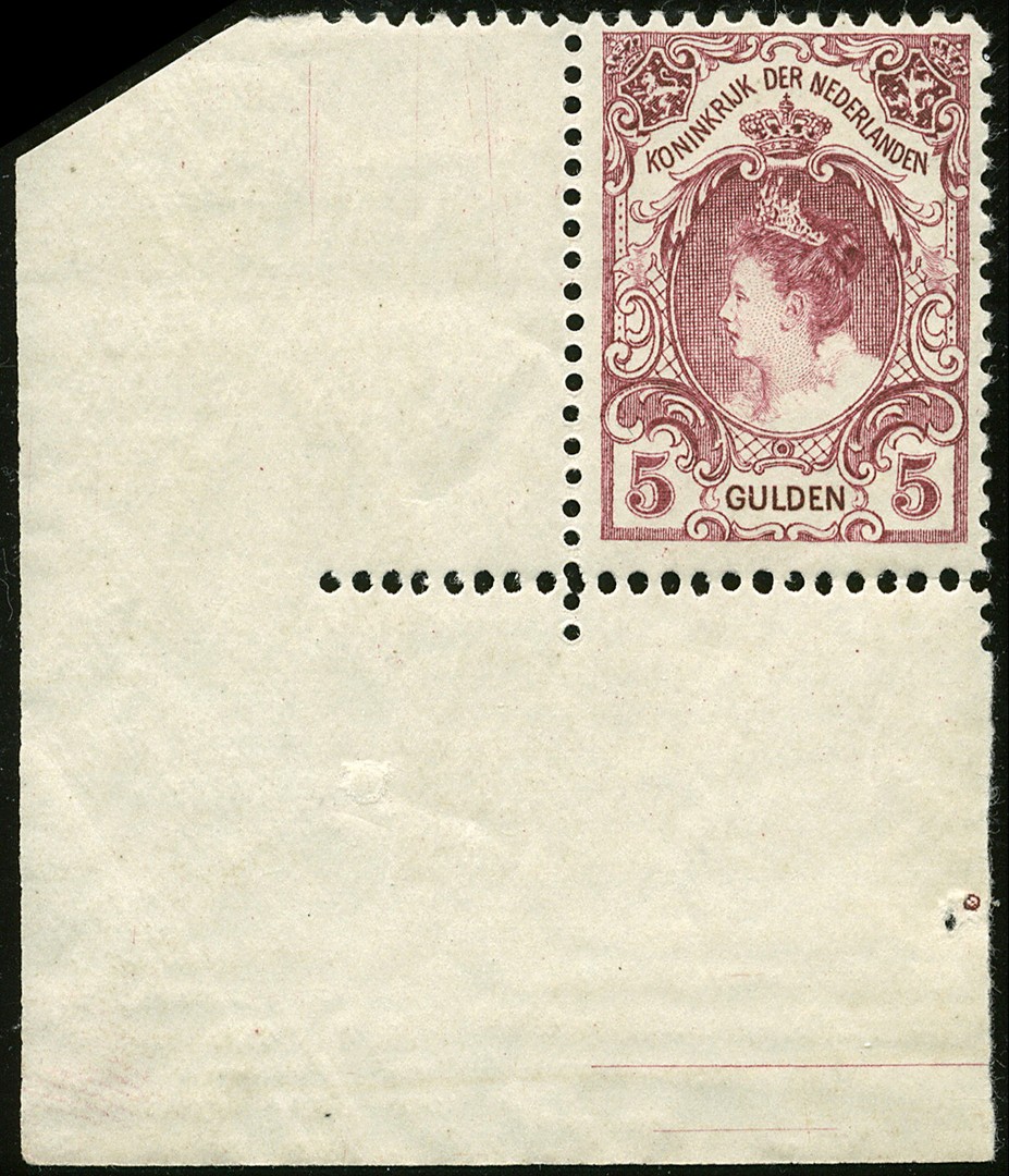 79D, 5 Gulden wijnrood, Lt.11½, postfris pracht hoekrandstuk € 925