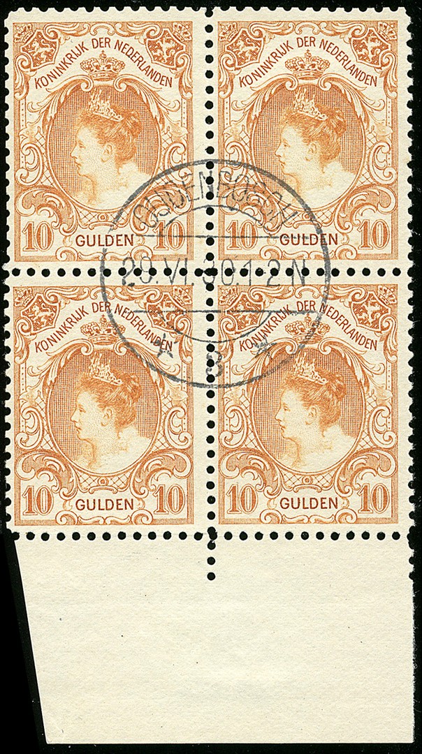 80, 10 Gulden oranje in luxe centraal gestempeld blok van vier met ondervelrand 'Oudenbosch 29-VI-30" € 3000