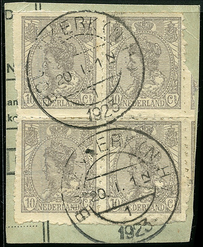 83, 10 cent met door het hulppostkantoor Bovenkerk (N.H.) zelf aangebrachte noodtanding in blok van vier op knipsel uit een postpakketkaart voor een binnenlands pakket, afgestempeld op 20-1-1923. Uitermate zeldzaam. Afgebeeld en beschreven in HPN.A9-87 afb. 163